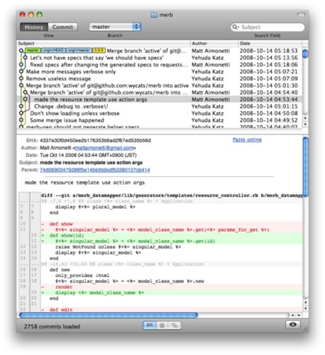 Git には、Git リポジトリを視覚化する gitk というツールが標準でついているけど、これは Tcl/Tk で書かれていて、遅いし見栄えもよくない。もし Mac OS X Leopard を使っているなら、かわりに GitX を使うといいみたい。OS X のグラフィックを使っているの…